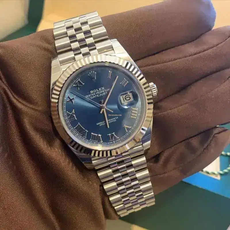 Newer blue dial with the roman numerals rolex datejust 41 blue jubilee. 41mm case with roman blue dial, fluted bezel material: